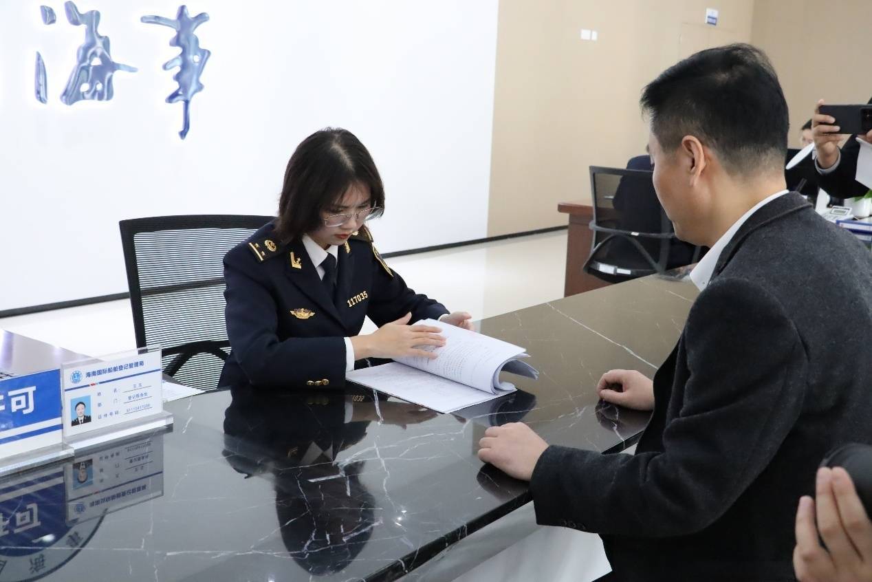 工作人员办理船舶入籍相关手续。海南国际船舶登记管理局供图
